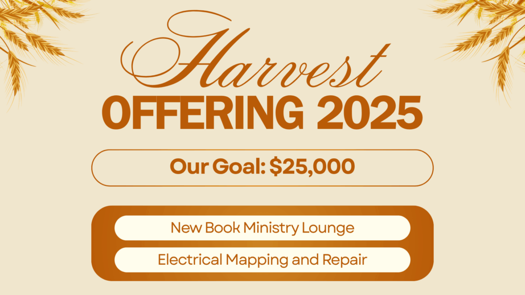 October 26th at 12:30pm – We are collecting our annual Harvest Offering to make improvements on our building such as remodeling our old Welcome Center room and creating a new book ministry. We will also spend time mapping our electrical system to identify problems and make repairs to some of the oldest parts of our building. The luncheon is immediately following service downstairs in our Fellowship Hall.
