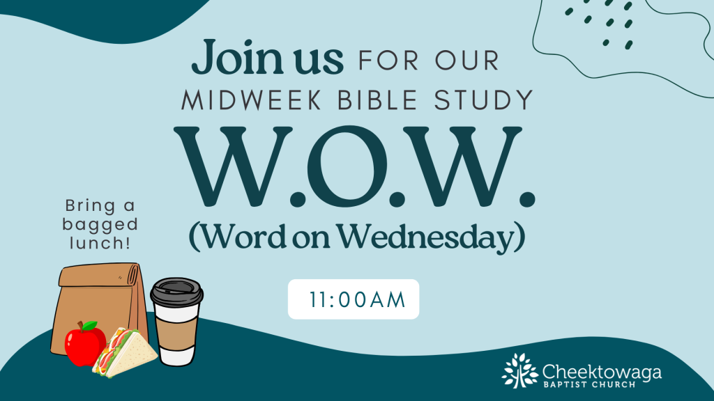 Word on Wednesday (WOW) is Cheektowaga Baptist’s mid-week adult Bible study that meets at 11am in Smith Hall every Wednesday. Please bring a bagged lunch and stay for a time of fellowship. Coffee and dessert provided.